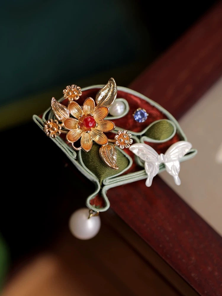 A golden blossom blooms with subtle brilliance, while a white butterfly hovers nearby — together they echo a sense of joy unfolding, harmony in motion, and the promise of something beautiful on its way. The pearl pendant adds a soft luster, symbolising purity, balance, and heartfelt wishes.