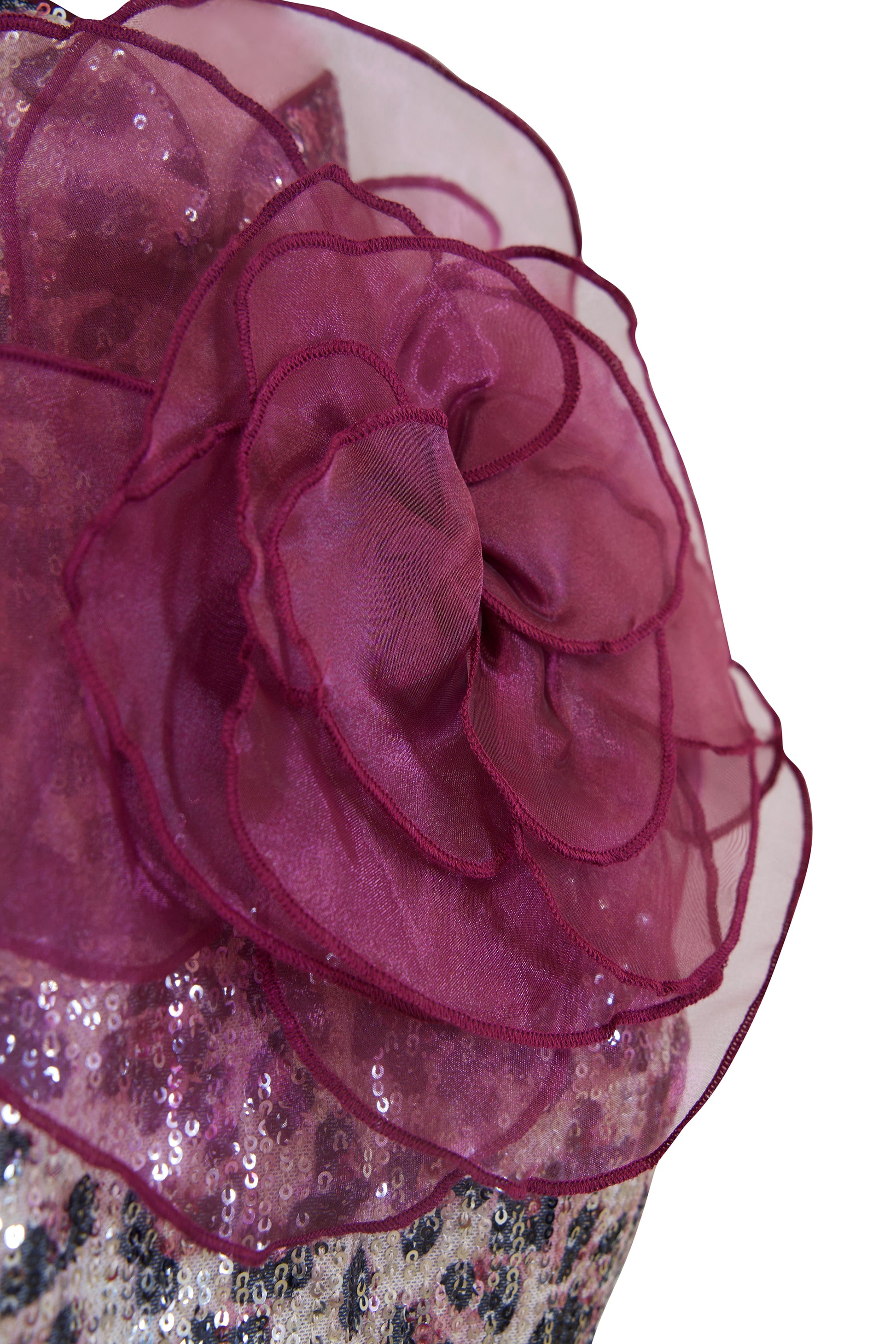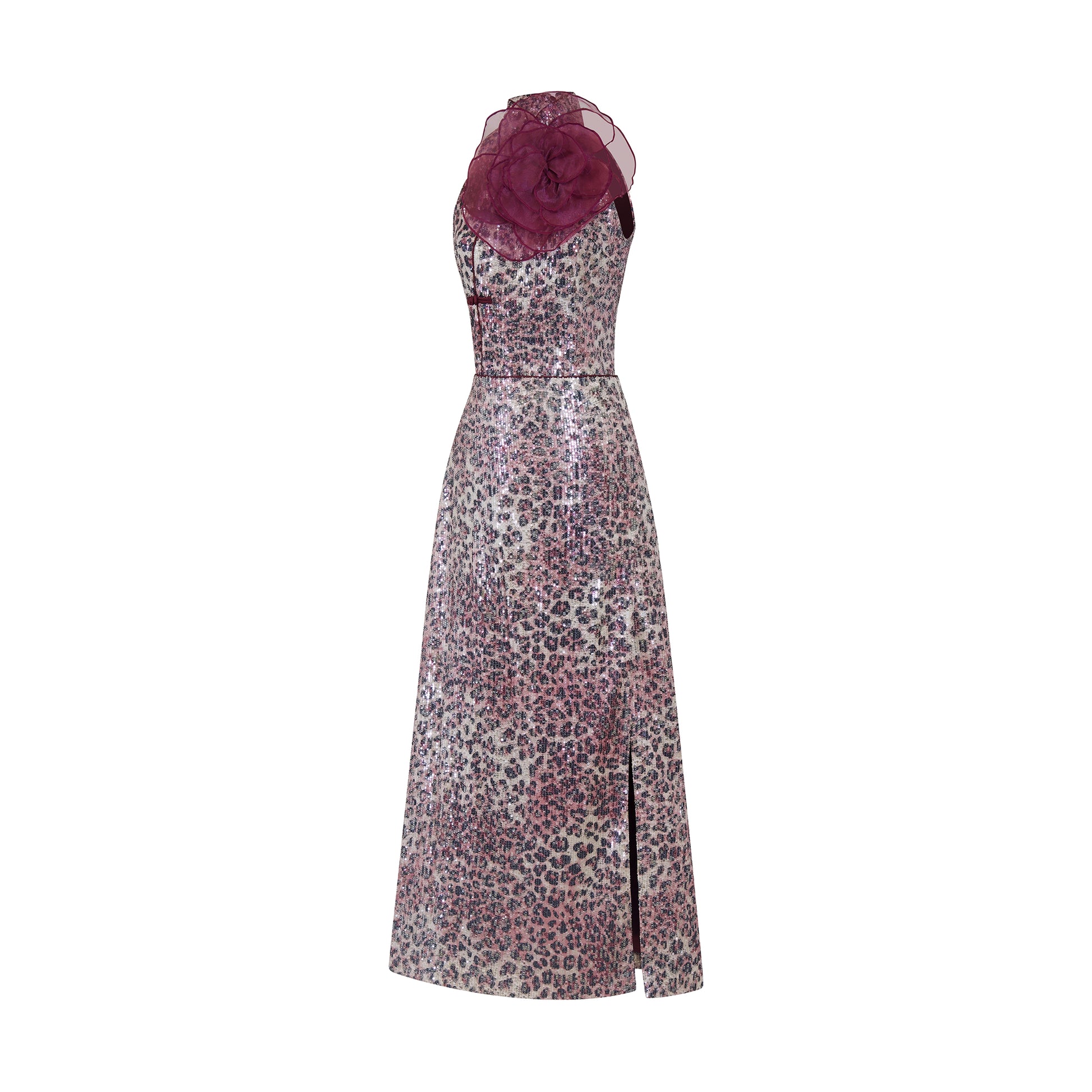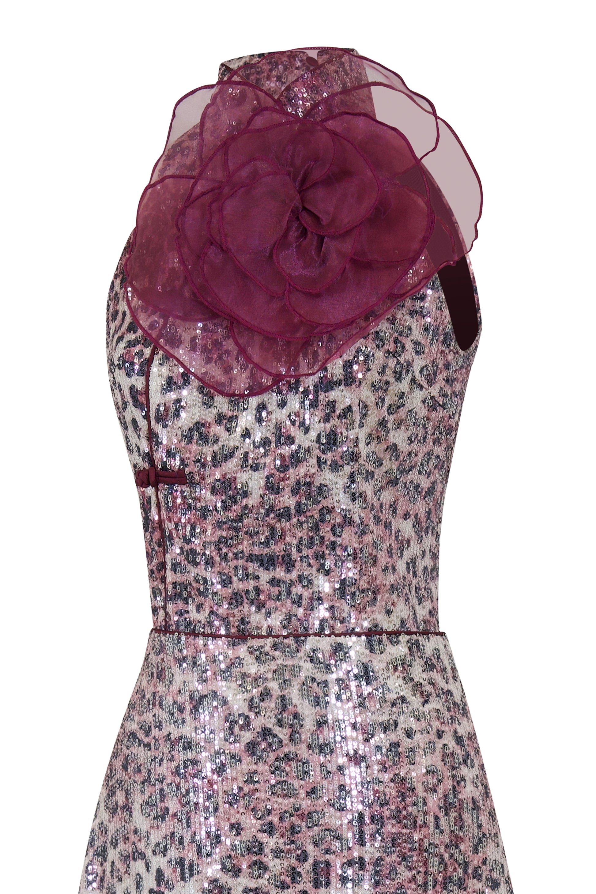 Inspired by the eternal icon Raquel Welch, this striking two-piece set combines a fitted halter top and a sleek A-line skirt. The custom-developed leopard sequin fabric echoes Raquel’s unapologetic drama, while the oversized plum organza flower and oriental knot details nod to ‘60s glam and heritage elegance.