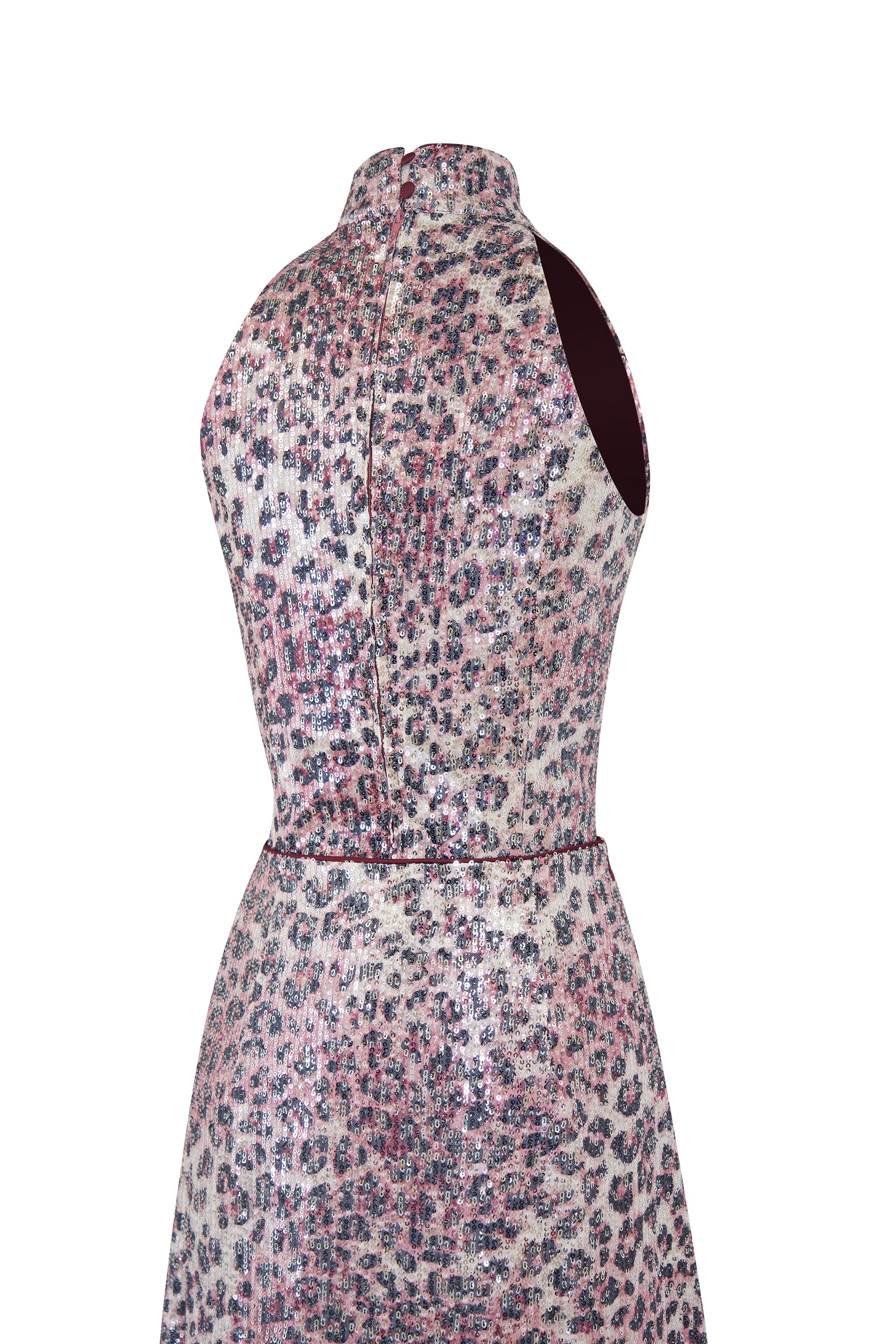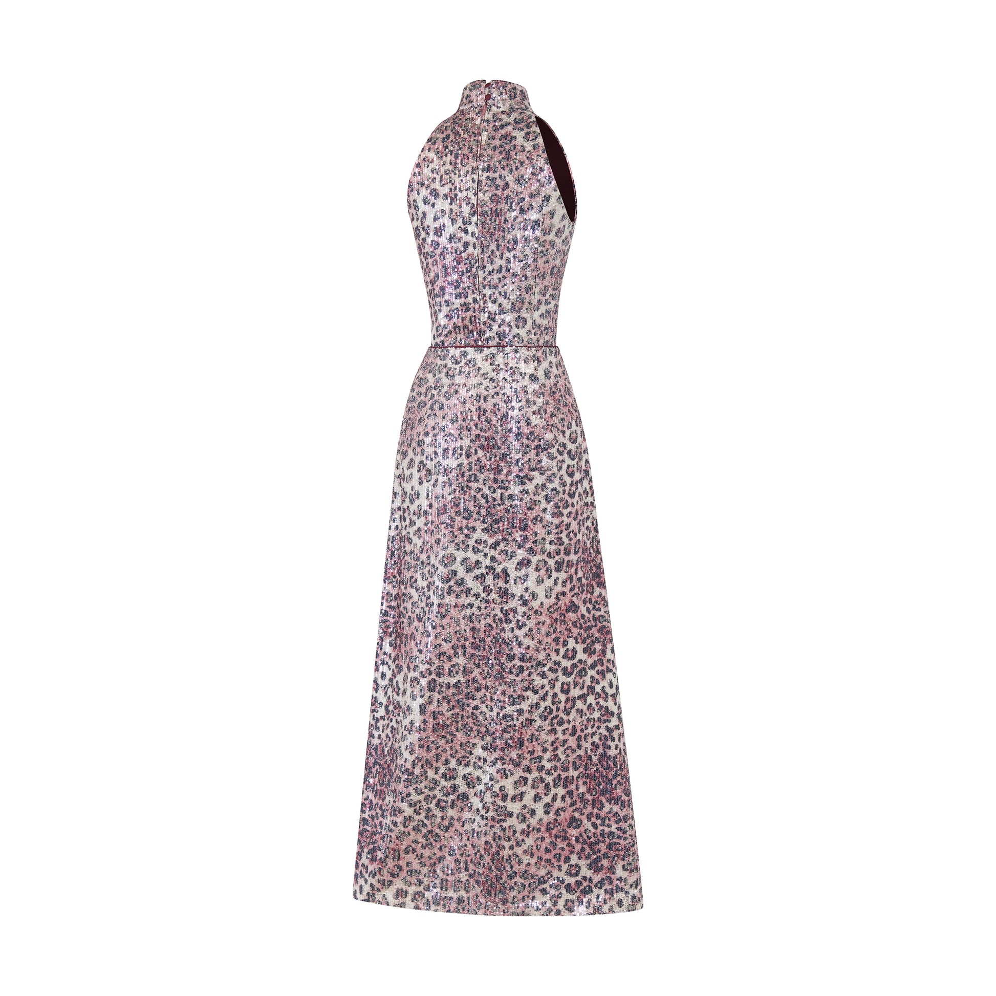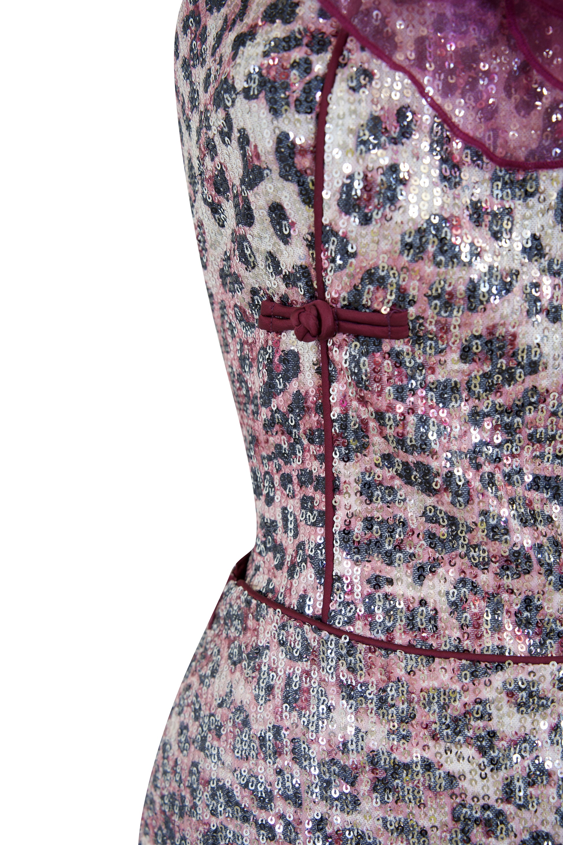 Inspired by the eternal icon Raquel Welch, this striking two-piece set combines a fitted halter top and a sleek A-line skirt. The custom-developed leopard sequin fabric echoes Raquel’s unapologetic drama, while the oversized plum organza flower and oriental knot details nod to ‘60s glam and heritage elegance.