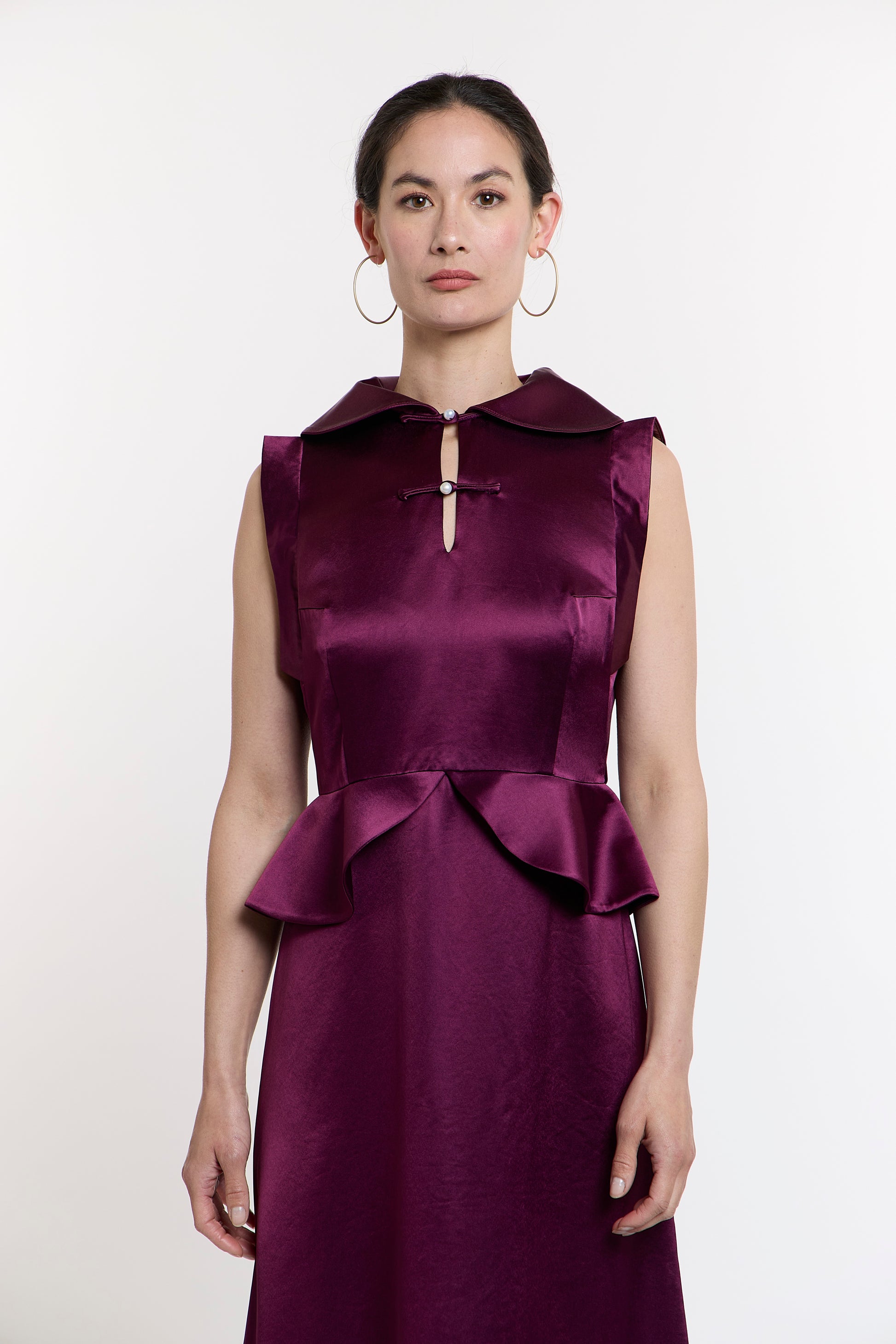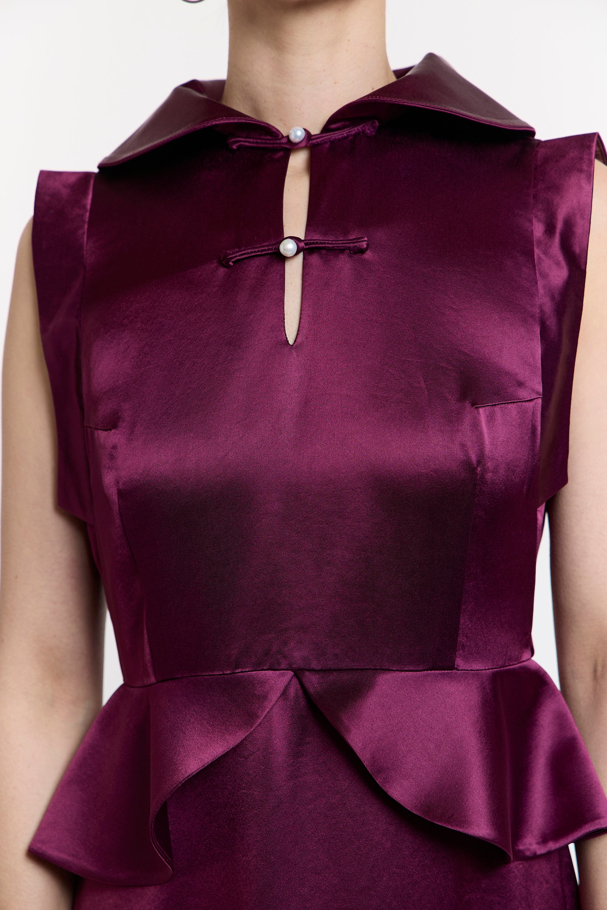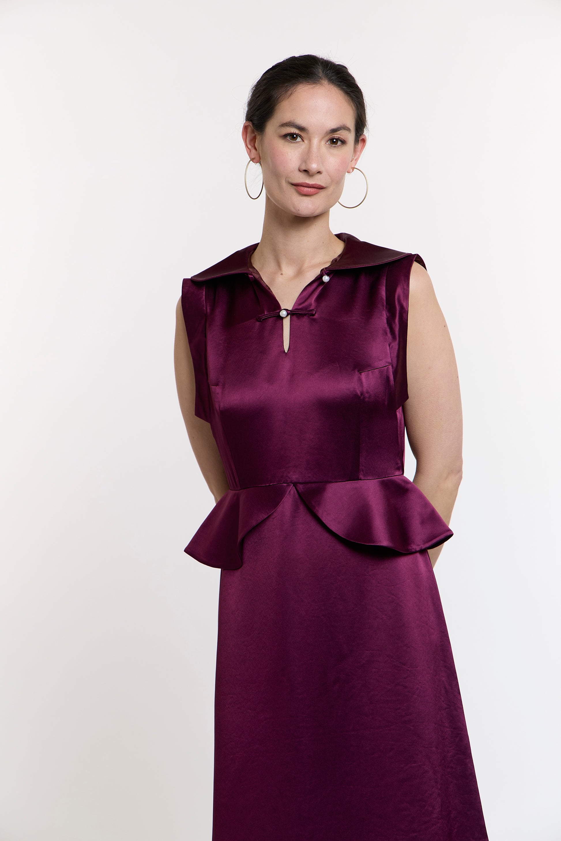 Zara's Zenith Gown is a peplum dress showcases versatility with three distinct collar styles: elevate the collar for an air of sophistication, fold it halfway down for a touch of elegance, or undo the first Pankou button to spread the collar gracefully over the shoulders. The A-line skirt further enhances its allure, making you the center of attention wherever you go.